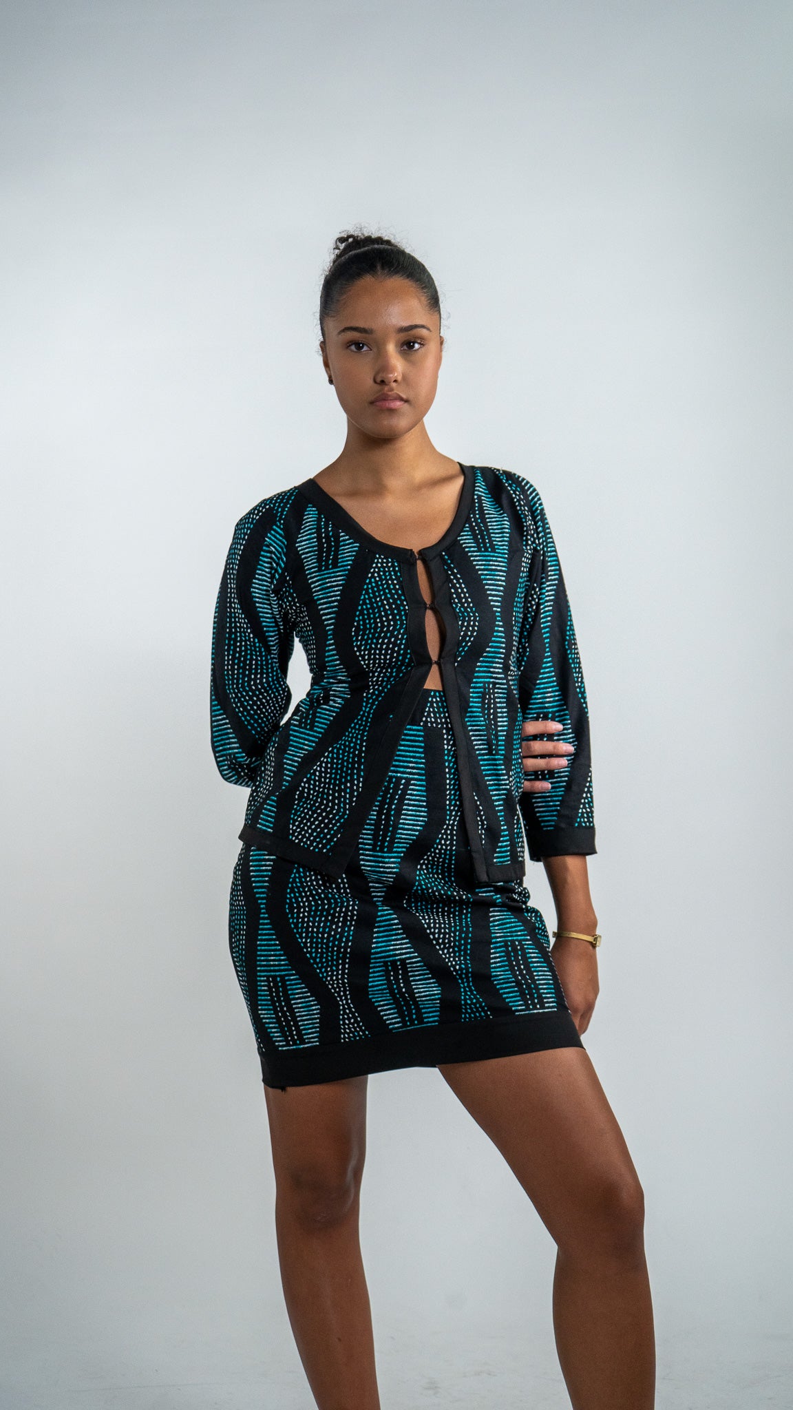Les attaches à l’avant ajoutent une touche originale, tandis que la longueur légèrement courte le rend facile à associer avec la jupe assortie ou un pantalon taille haute.